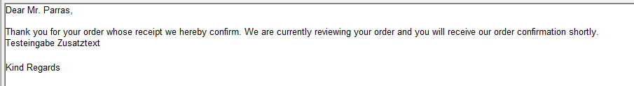 ««vielen Dank für Ihre Bestellung, deren Eingang wir Ihnen hier bestätigen. ¶¶ Nach Prüfung der Bestellung senden wir Ihnen unsere offizielle Auftragsbestätigung zu.")»»