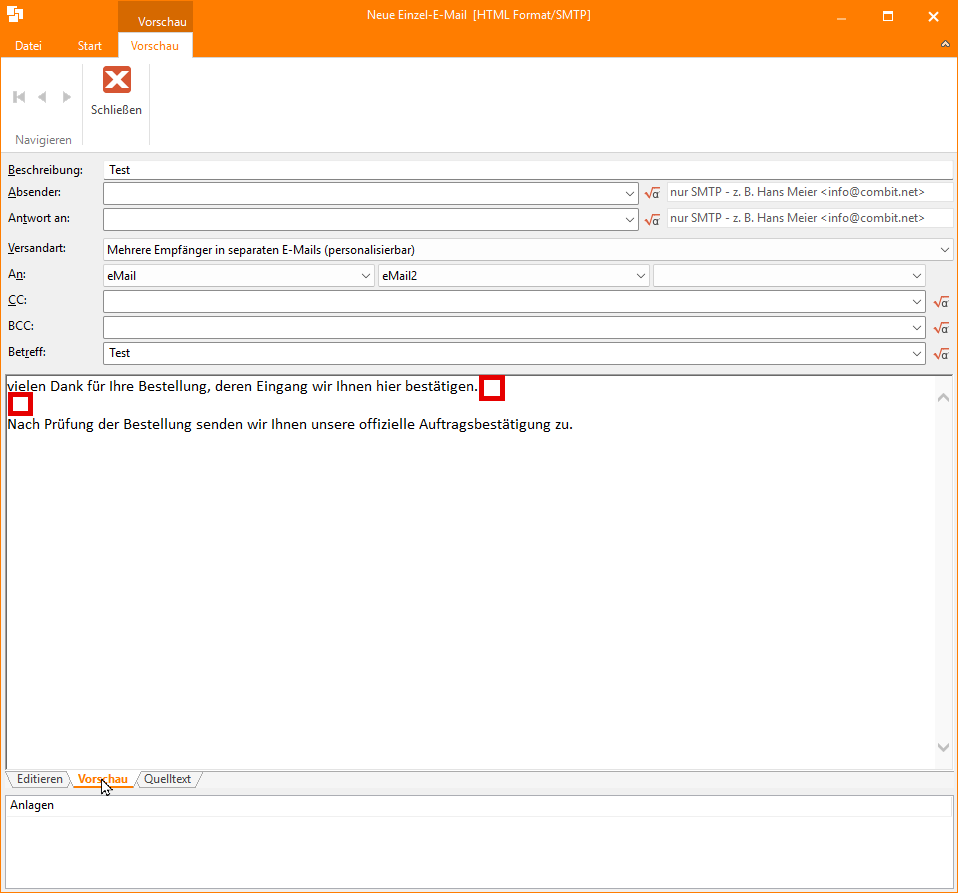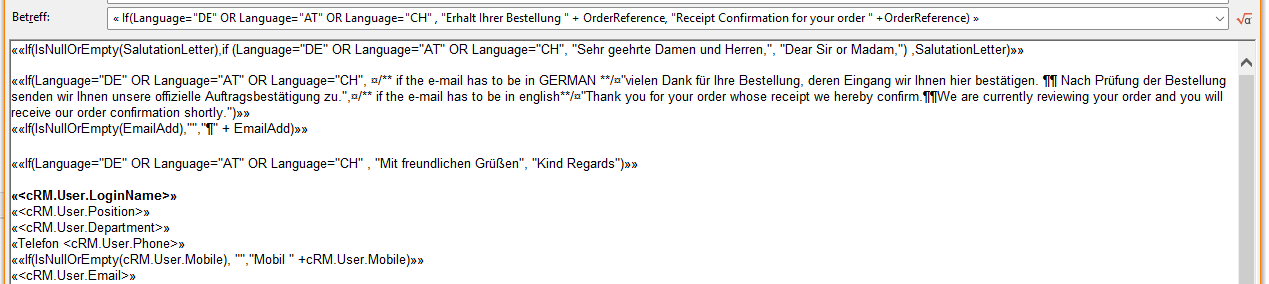 Das müssen wir uns angucken, was es mit der Vorlage auf sich hat und warum die anders funktioniert als unsere Tests. Können Sie kurz aus Ihrem cRM heraus einen Support-Case anlegen und uns die MTPX-Datei (Mailvorlagendatei) gleich mit reinhängen? Beziehen Sie sich einfach kurz auf diesen Thread hier.