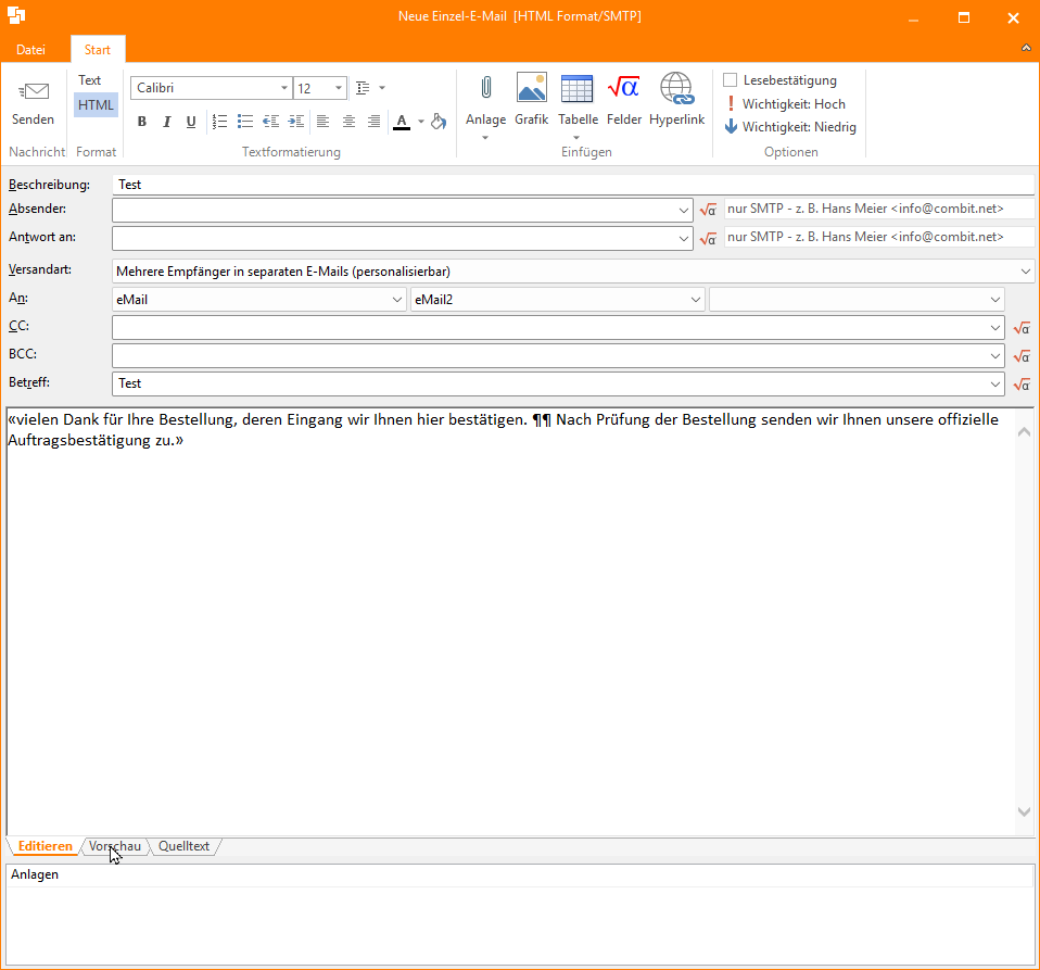 Wir setzen in einer Vorlage innerhalb des festen Textes nach Bedarf noch einen Eintrag, um dem Versender die Möglichkeit zu geben, doch noch manuell einen kurzen Zusatz mit in die Email einzusetzen, ohne im Editor herumspielen zu müssen. (EmailAdd)