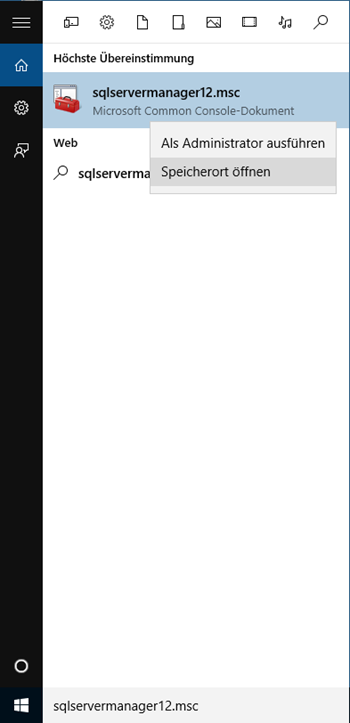 Da der SQL Server-Konfigurations-Manager ein Snap-In für das Microsoft-Verwaltungskonsolenprogramm und kein eigenständiges Programm ist, wird der SQL Server-Konfigurations-Manager beim Ausführen von Windows 8 nicht als Anwendung angezeigt.Um den SQL Server-Konfigurations-Manager im Charm Suchen unter Apps zu öffnen, geben Sie SQLServerManager12.msc (für SQL Server 2014), SQLServerManager11.msc (für SQL Server 2012) oder SQLServerManager10.msc (für SQL Server 2008) ein und bestätigen dann mit der Eingabetaste.Über folgenden Weg kann anschließend eine Verknüpfung für die Taskleiste erstellt werden: